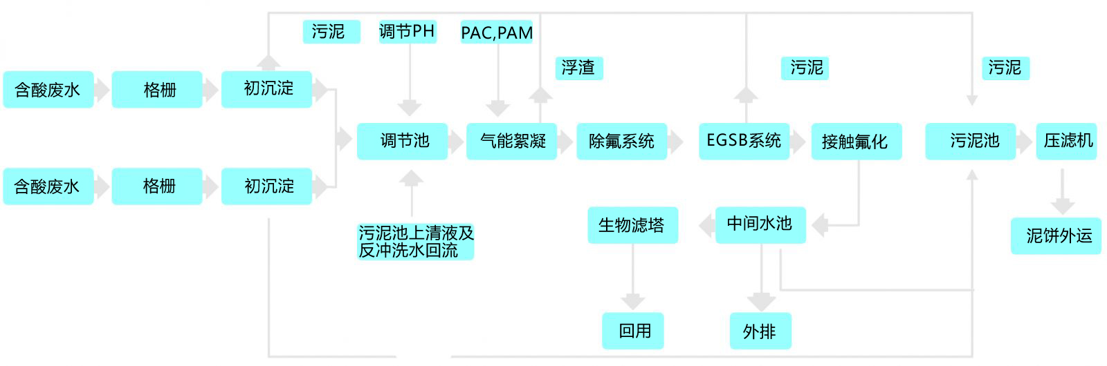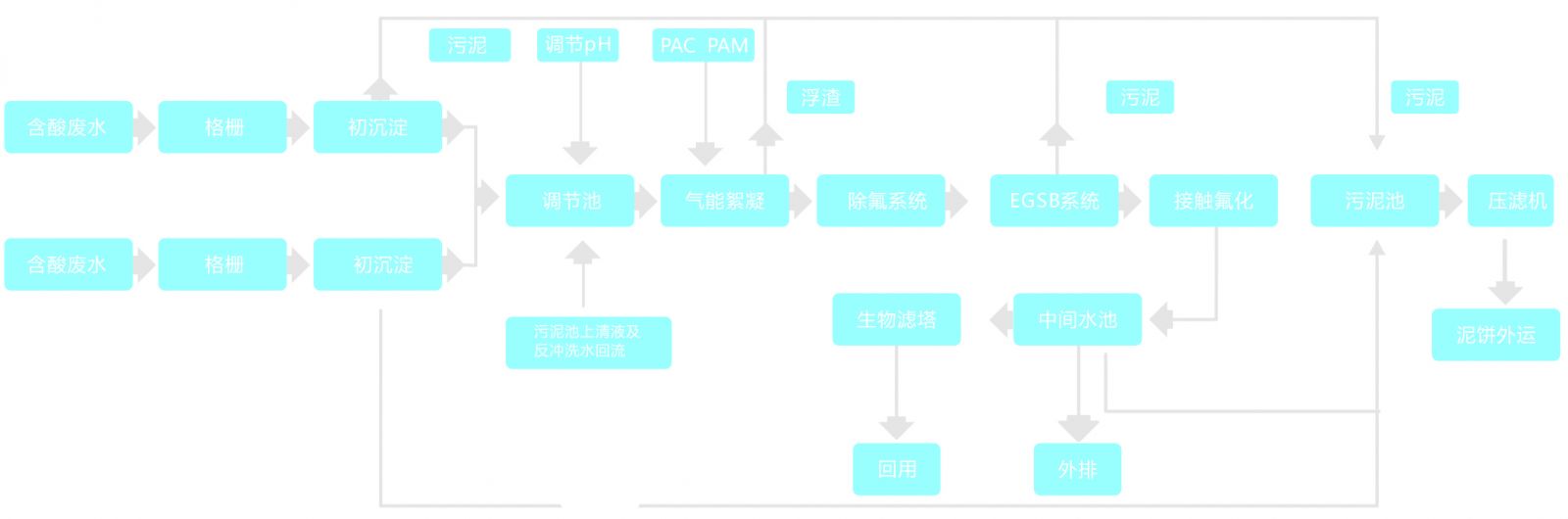 各生產(chǎn)車間外排廢水(酸水和堿水分流)由管網(wǎng)經(jīng)格柵排渣后進(jìn)入初沉池,靜沉去除大部分浮渣與大顆粒污染物后進(jìn)入調(diào)節(jié)池,調(diào)節(jié)pH后提升至氣能絮凝池,投加絮凝劑進(jìn)一步去除水中懸浮物,出水進(jìn)入除氟裝置,通過投加專用活性吸附劑去除水中高濃度的氟化物。接著進(jìn)入EGSB反應(yīng)器進(jìn)行生化處理,利用兼性及專性厭氧菌降解污水中COD,并將大分子有機(jī)物分解為小分子化合物以改善其可生化性,出水進(jìn)入接觸氧化池,通過負(fù)載于填料上生物膜的作用,進(jìn)一步去除水中COD等有機(jī)污染物,經(jīng)由中間水池進(jìn)行固液分離后上清液水質(zhì)達(dá)標(biāo)外排,或進(jìn)入生物濾塔深度處理后回用。