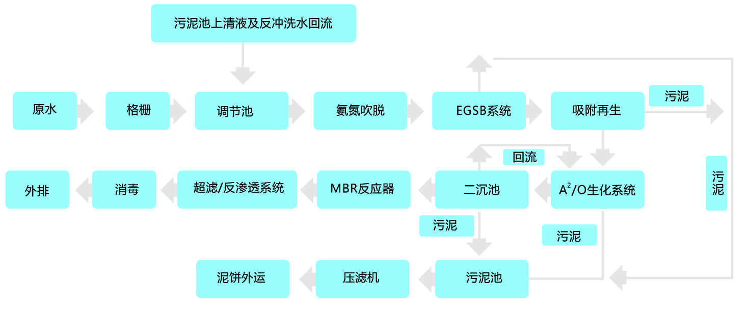 EGSB反應器、吸附再生池及二沉池產生的剩余污泥收集于污泥池,濃縮并經壓濾機脫水后外運。